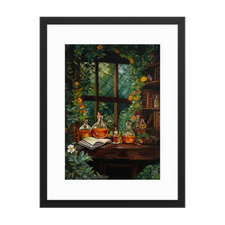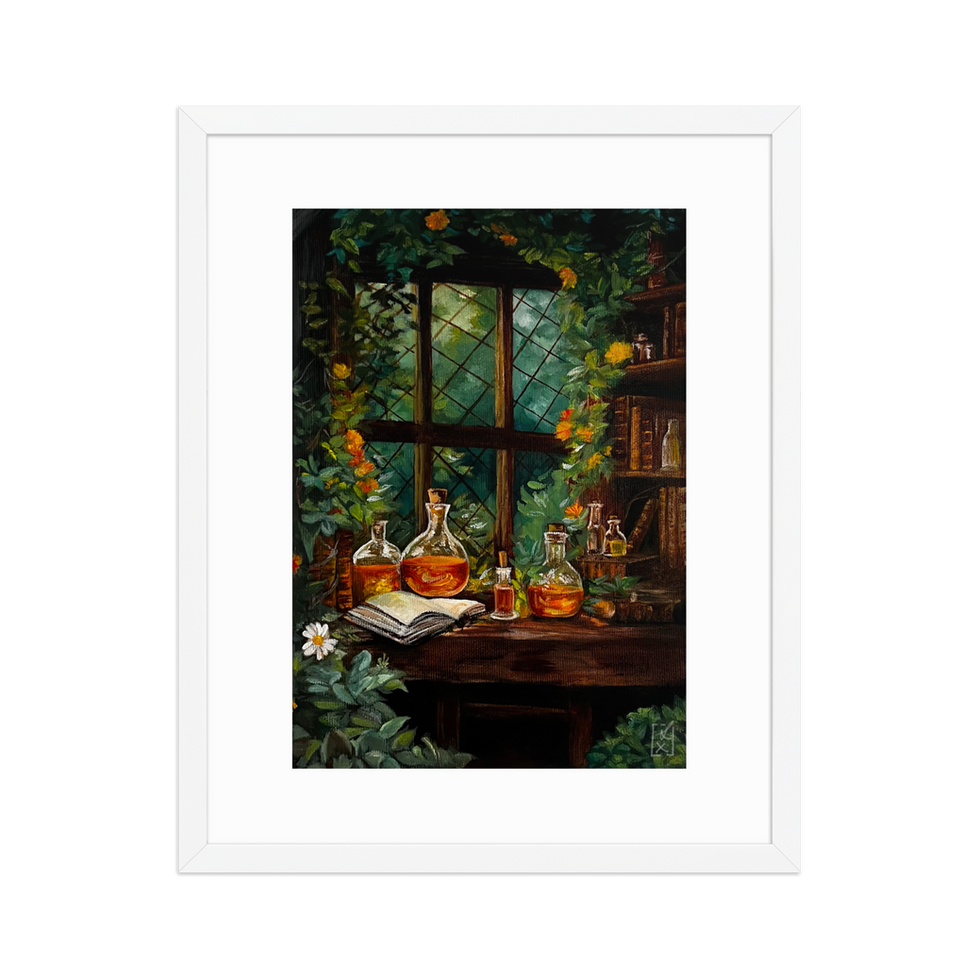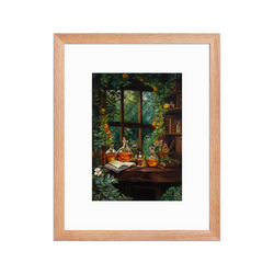 Apothecary’s Window, rendered in oil on canvas. A cozy witchy depiction of potion bottles settled among books, as plants and ivy grow around the window. • Ayous wood .75″ (1.9 cm) thick frame from renewable forests • Paper thickness: 10.3 mil (0.26 mm) • Hanging hardware included