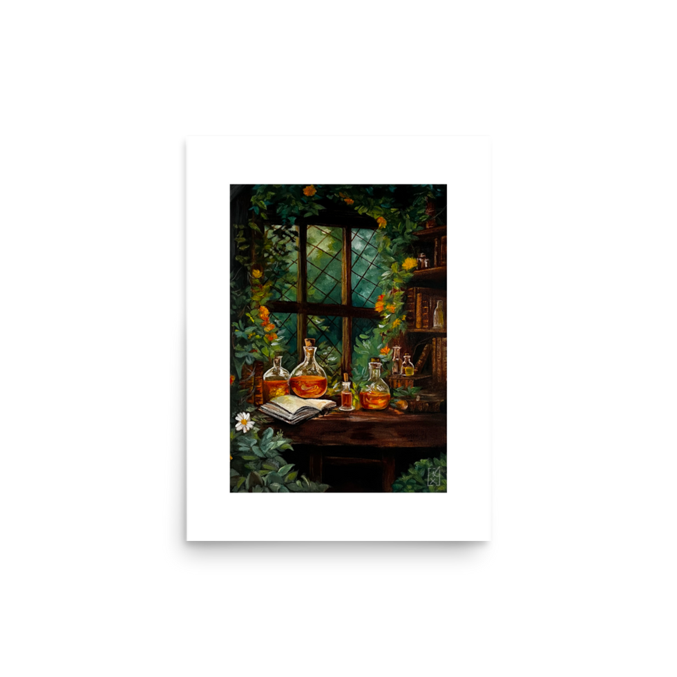 Apothecary’s Window, rendered in oil on canvas. A cozy witchy depiction of potion bottles settled among books, as plants and ivy grow around the window. • Paper thickness: 10.3 mil • Paper weight: 189 g/m²