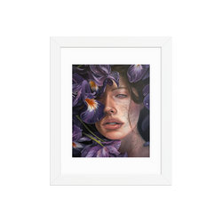 Oil on canvas, a woman’s face surrounded by irises, gently cradling her. A tattoo of a peony on her cheek. An examination of how my love of florals and botanical work furthered my tattoo career. • Ayous wood .75″ (1.9 cm) thick frame from renewable forests • Paper thickness: 10.3 mil (0.26 mm) • Hanging hardware included